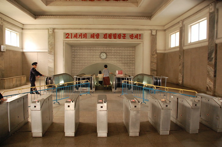 According to Koryo Tours, a ride beneath the streets of the North Korean capital costs around five Korean Won — that’s just over 3p, and around 80 times cheaper that a zone 1-2 single in London. We really are going to have to shift some novelty moquette products, aren’t we.